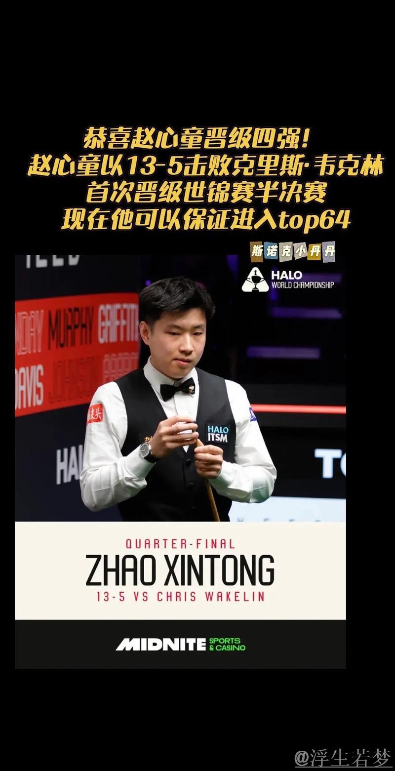 北京时间4月XX日,2024年斯诺克世锦赛在谢菲尔德克鲁斯堡剧院继续进行,在一场备受瞩目的1/4决赛中,中国名将赵心童以稳定而高效的发挥击败英格兰选手韦克林,职业生涯首次闯入世锦赛四强,改写个人大赛最